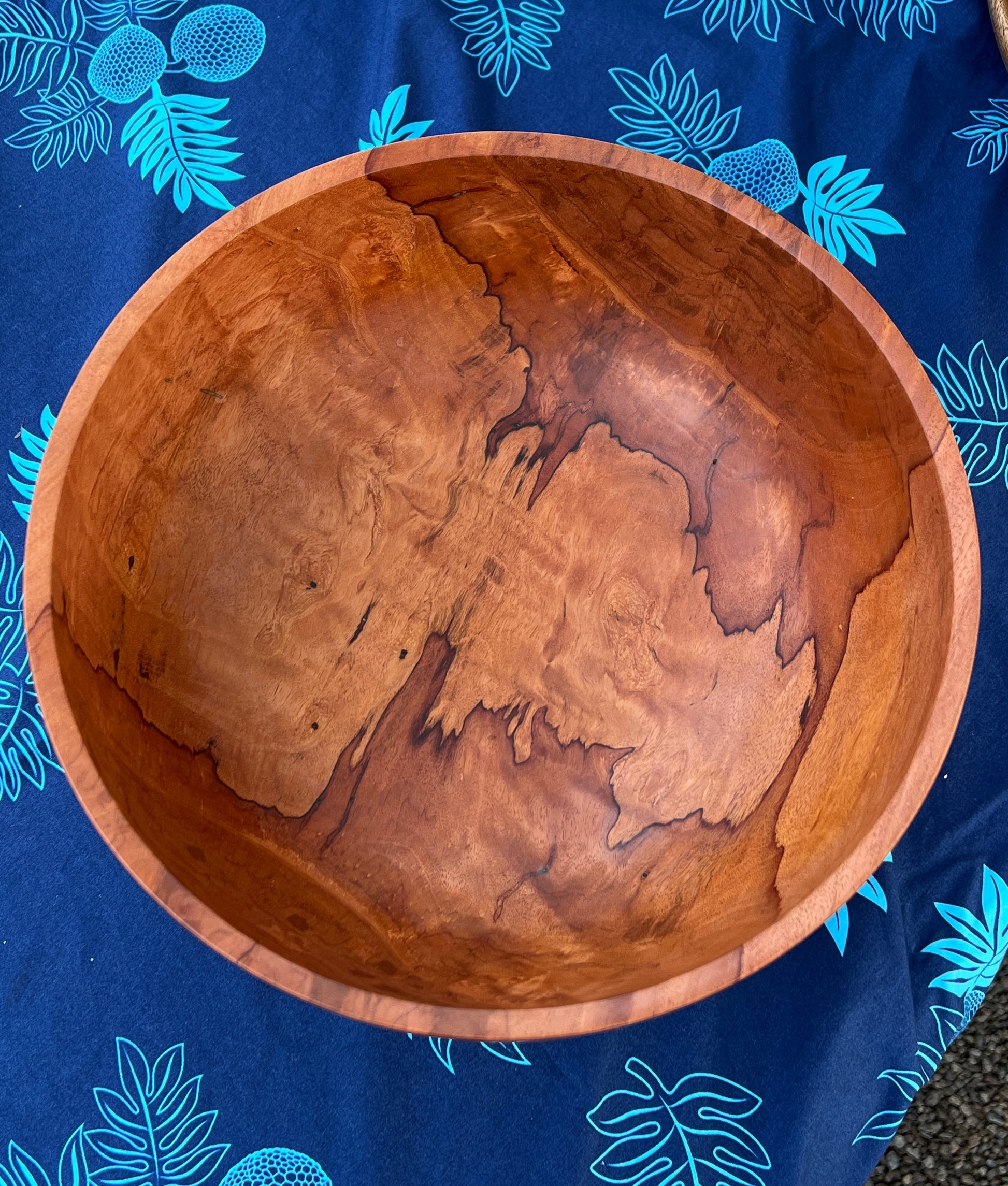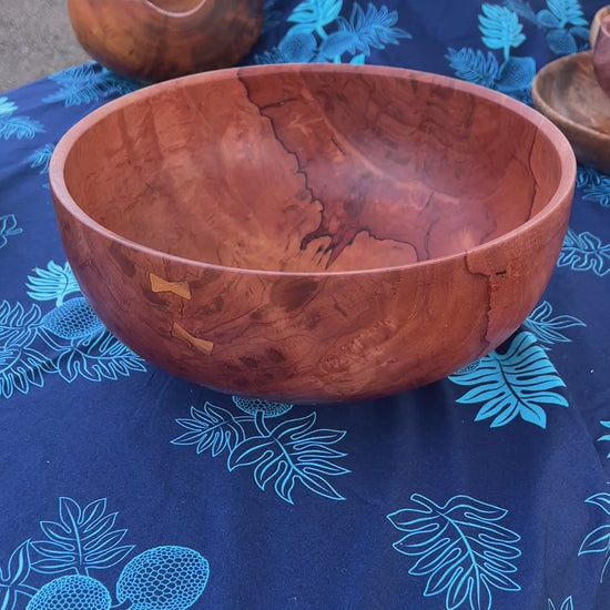 Kauai grown lychee fruit wood bowl finished with foodsafe liquid ceramic finish. 13” diameter by 5.5” tall. Several Koa pewa (fishtails) used to stabilize potential splits