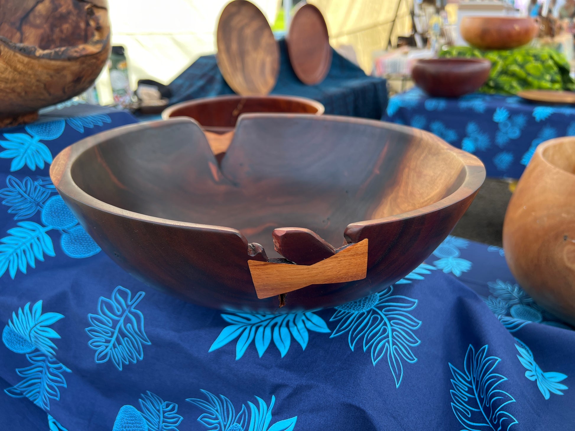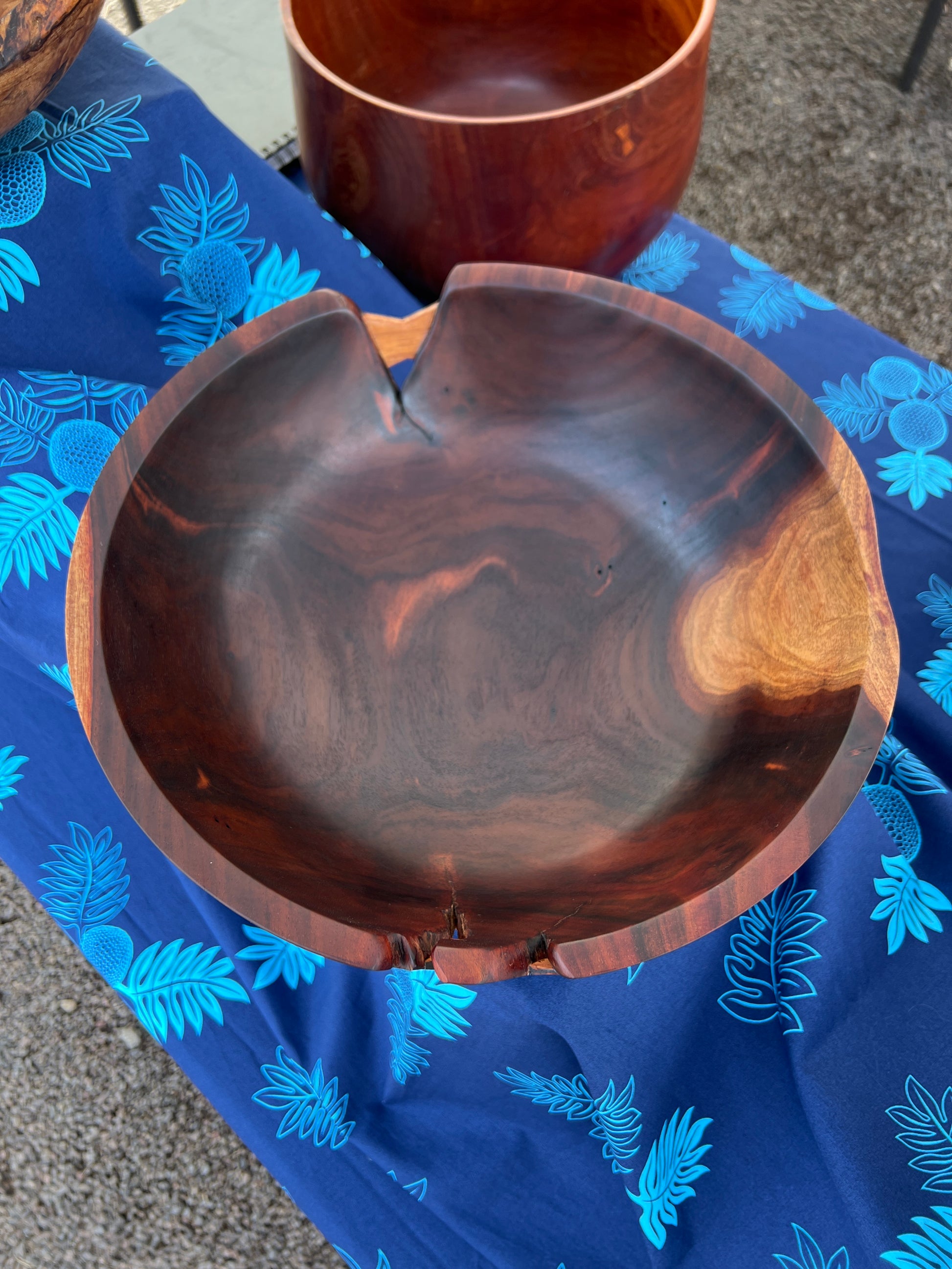13” x 5” Milo wood bowl with 2 giant (fishtail stitches) made of koa wood finished with a foodsafe walnut oil.